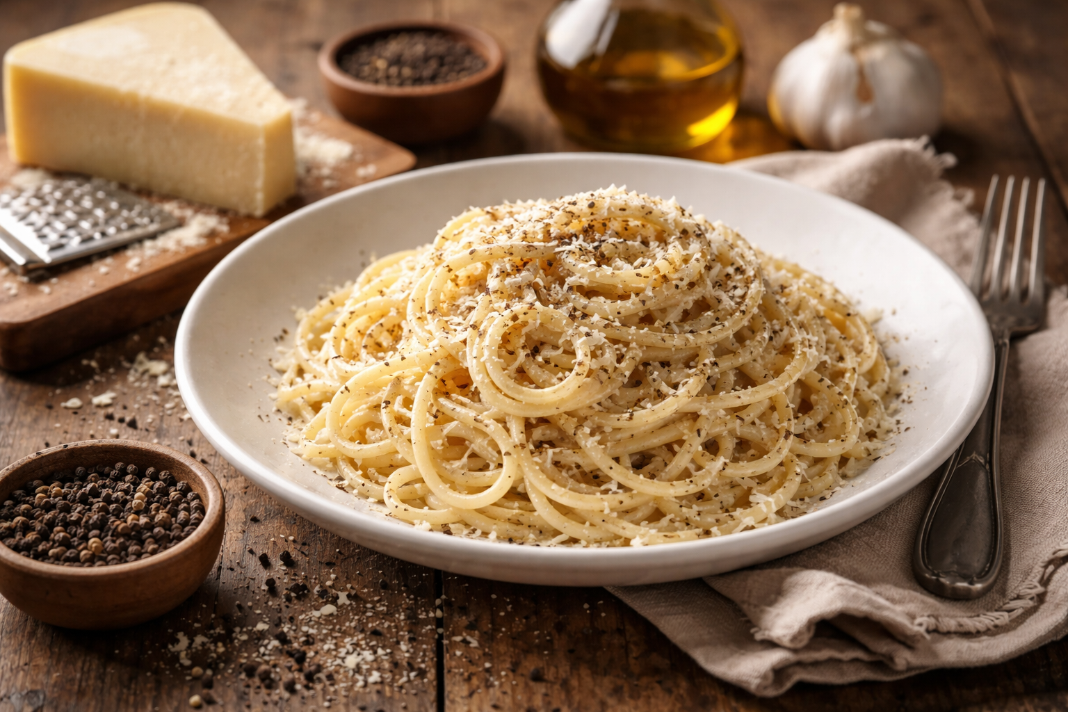Le pecorino doit être râpé très finement pour fondre correctement avec l’eau chaude sans former de grains. Quant au poivre, il mérite d’être concassé ou moulu juste avant utilisation. Un poivre pré-moulu manque souvent de relief et affadit la recette.